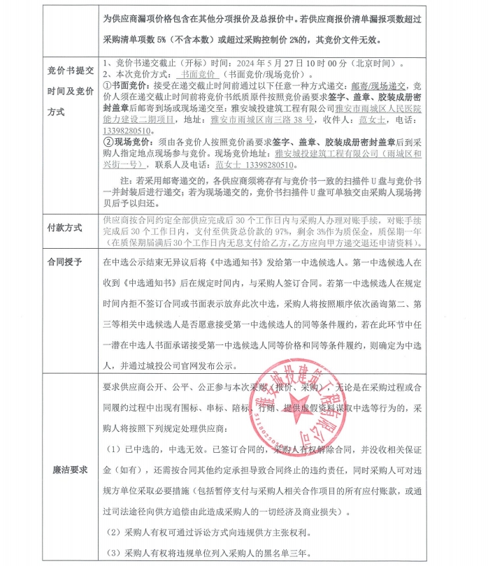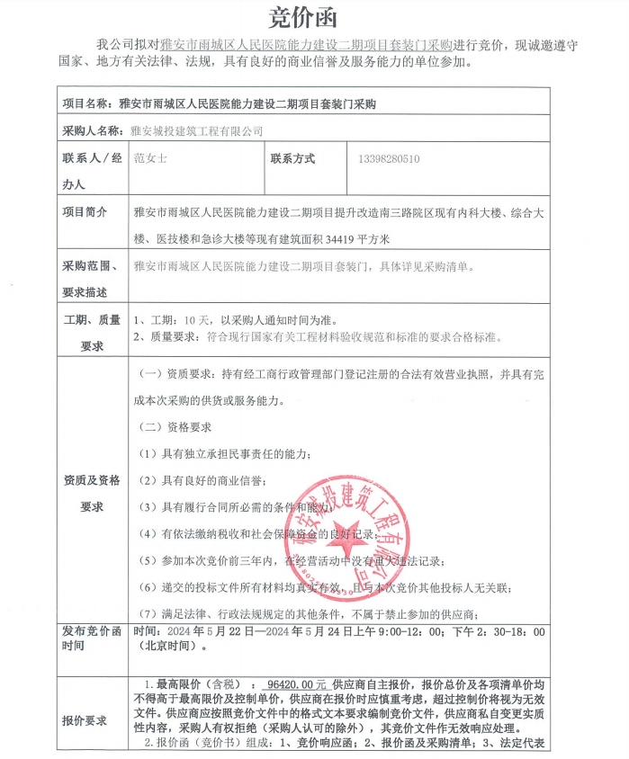 雅安市雨城區(qū)人民醫(yī)院能力建設二期項目套裝門采購競價公告