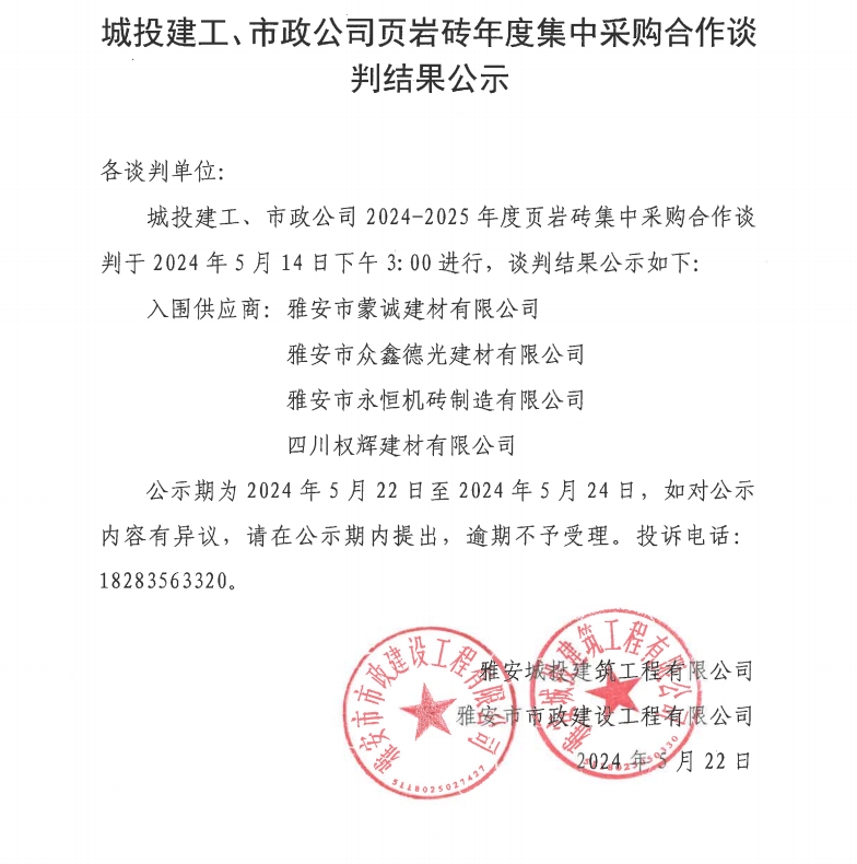 城投建工、市政公司頁巖磚年度集中采購(gòu)合作談判結(jié)果公示