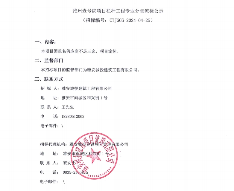 雅州壹號院項目欄桿工程專業(yè)分包流標(biāo)公示
