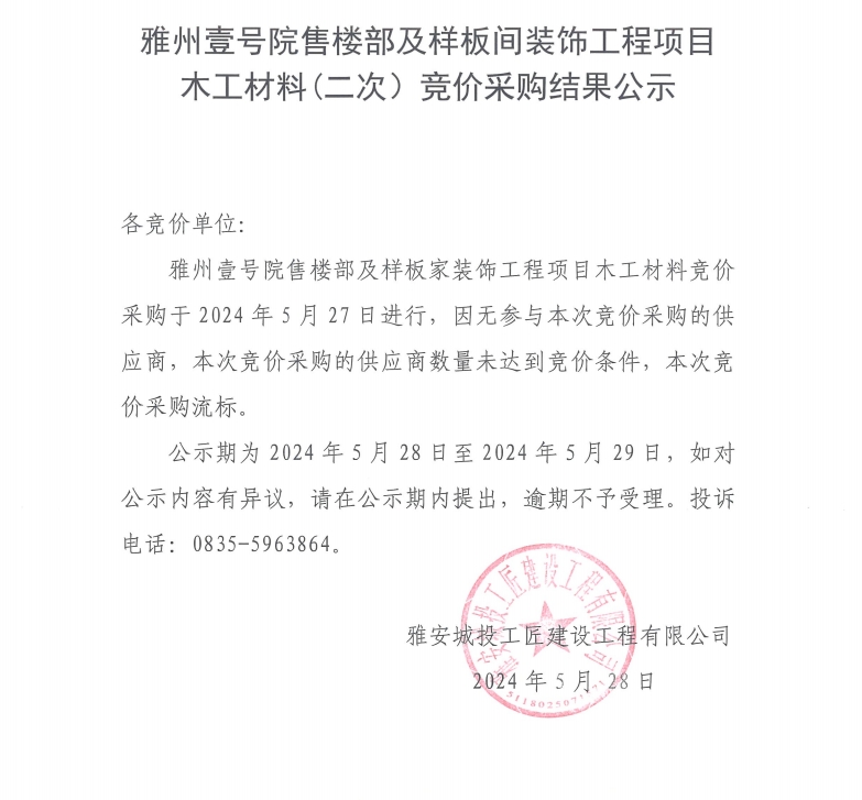 雅州壹號(hào)院售樓部及樣板間裝飾工程項(xiàng)目木工材料(二次)競(jìng)價(jià)采購(gòu)結(jié)果公示