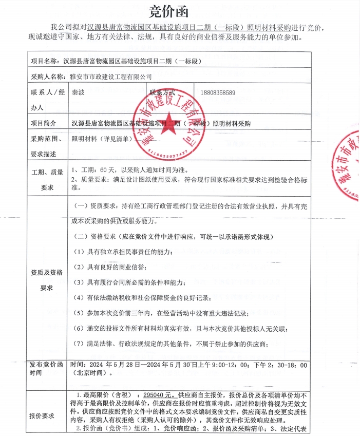 漢源縣唐富物流園區(qū)基礎(chǔ)設(shè)施項(xiàng)目二期(一標(biāo)段)照明材料采購競價(jià)公告