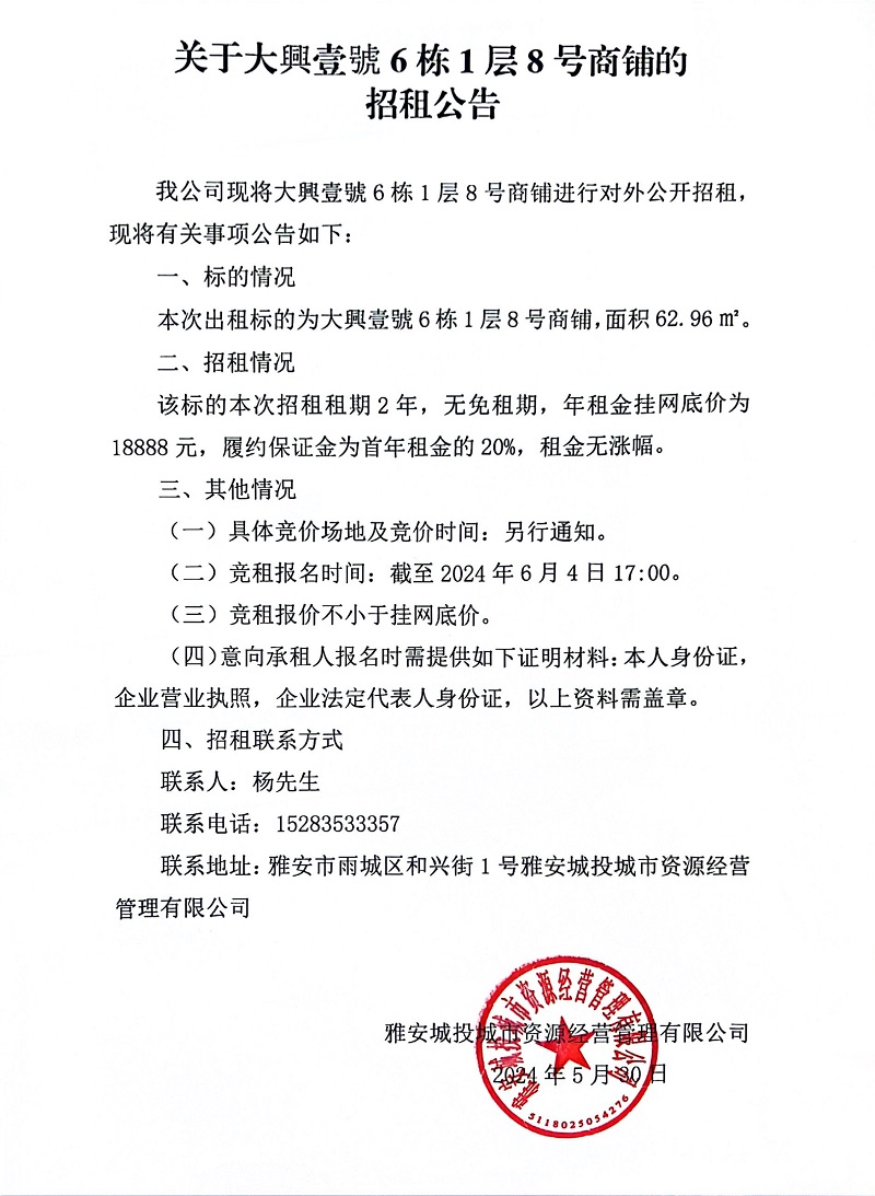 關(guān)于大興壹號6棟1層8號商鋪的招租公告