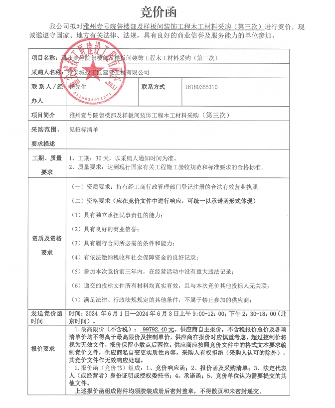 競價函-木工材料采購-雅州壹號院售樓部及樣板間(第三次)