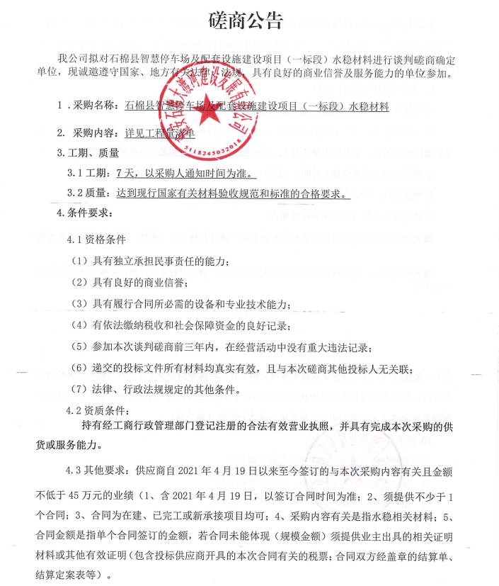 石棉縣智慧停車場及配套設(shè)施建設(shè)項(xiàng)目(一標(biāo)段)水穩(wěn)材料采購談判磋商公告