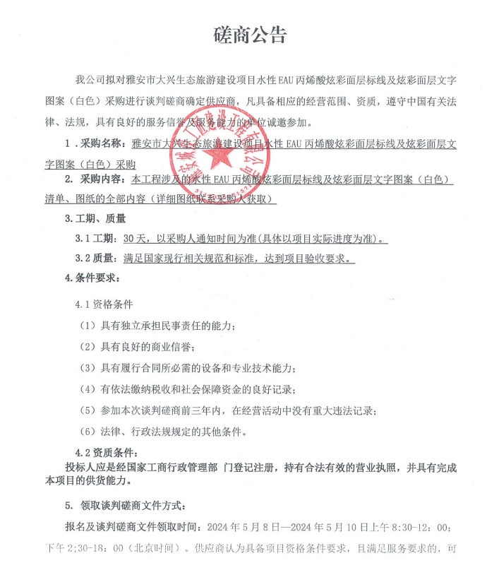雅安市大興生態(tài)旅游建設(shè)項(xiàng)目水性EAU丙烯酸炫彩面層標(biāo)線及炫彩面層文字圖案(白色)采購磋商公告