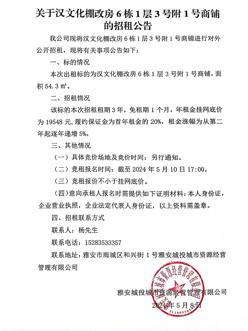 關于漢文化棚改房6棟1層3號附1號商鋪的招租公告