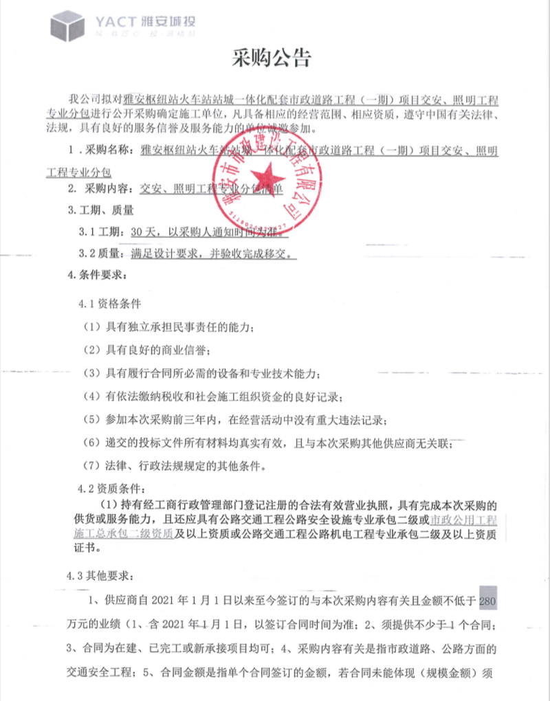 雅安樞紐站火車站站城一體化配套市政道路工程(一期)項(xiàng)目交安、照明工程專業(yè)分包采購公告