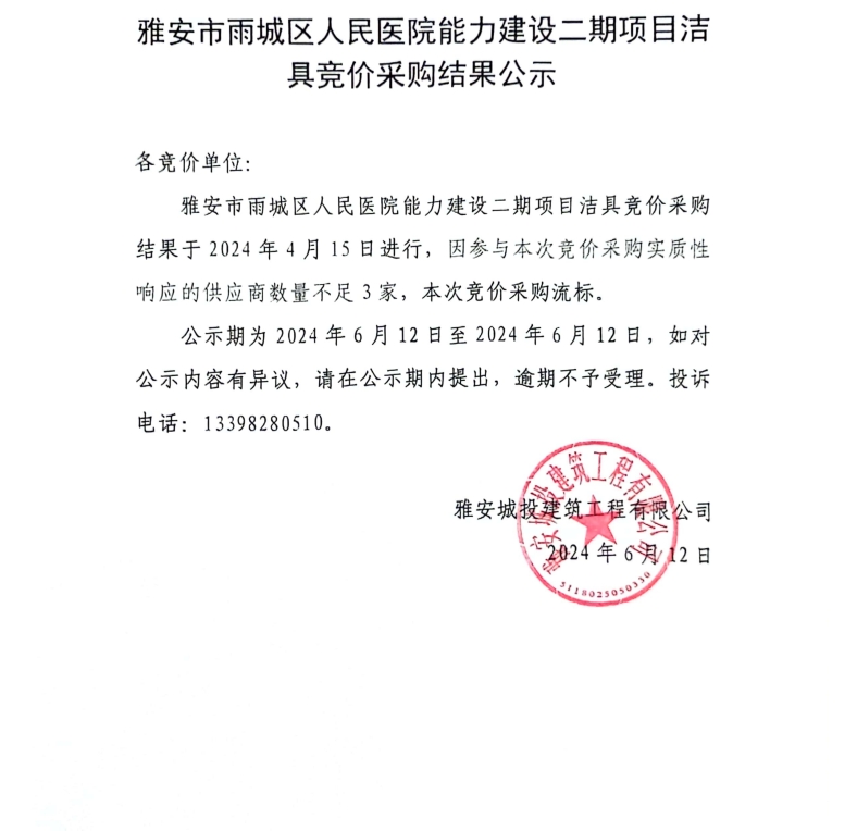 雅安市雨城人民醫(yī)院能力建設二期項目潔具競價采購結(jié)果公示