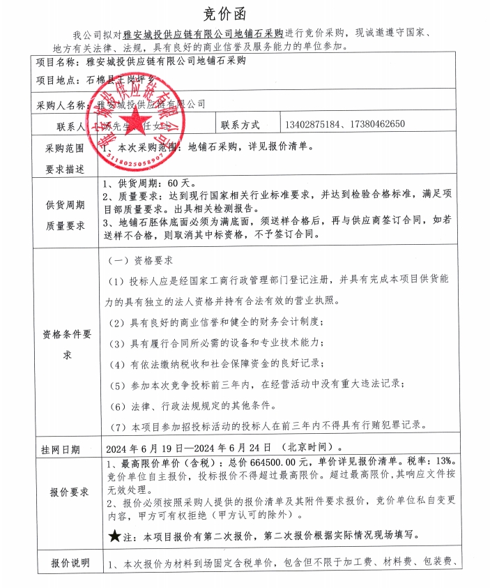 雅安城投供應(yīng)鏈有限公司地鋪石采購競價公告