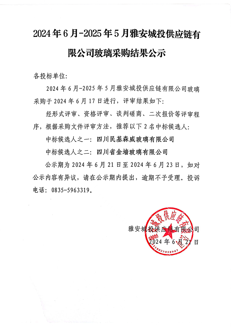 2024年6月-2025年5月雅安城投供應(yīng)鏈有限公司玻璃采購結(jié)果公示