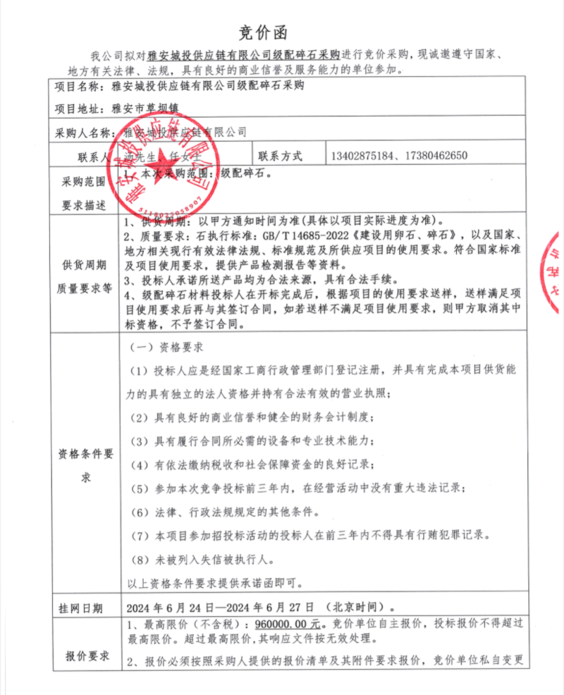 雅安城投供應鏈有限公司級配碎石采購競價公告