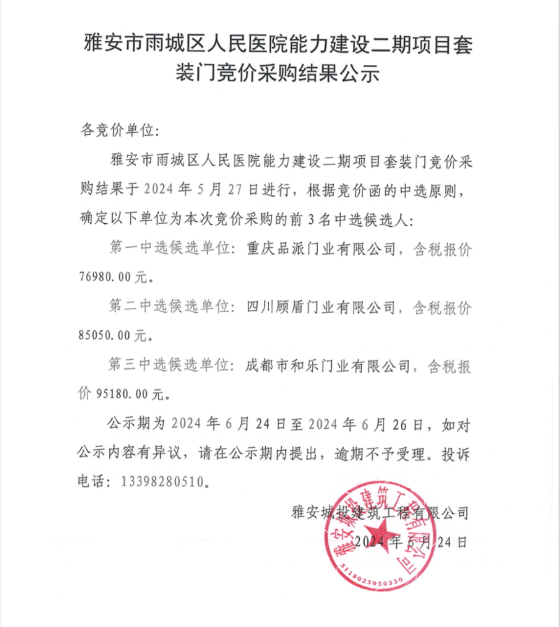 雅安市雨城區(qū)人民醫(yī)院能力建設(shè)二期項(xiàng)目套裝門競價(jià)采購結(jié)果公示