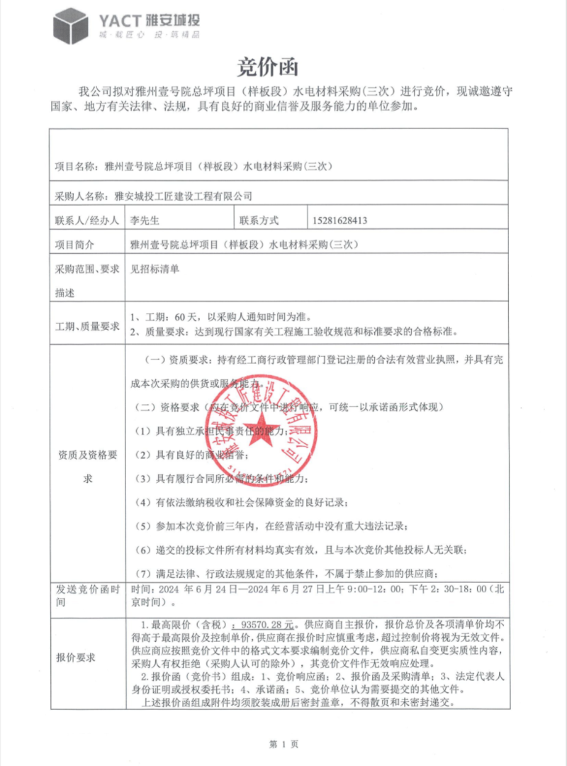 雅州壹號院總坪項(xiàng)目(樣板段)水電材料采購(三次)競價公告