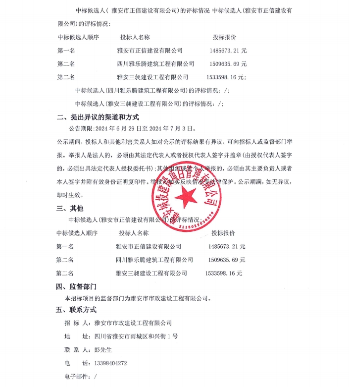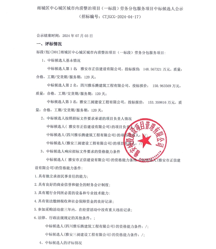 雨城區(qū)中心城區(qū)城市內(nèi)澇整治項目(一標段)勞務分包服務項目中標候選人公示