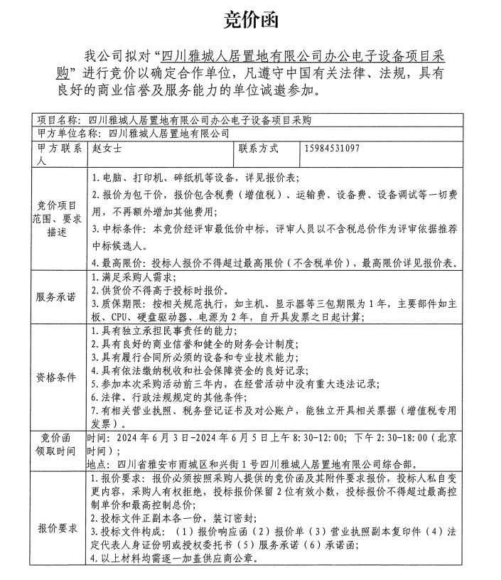 四川雅城人居置地有限公司辦公電子設(shè)備項(xiàng)目采購(gòu)競(jìng)價(jià)公告