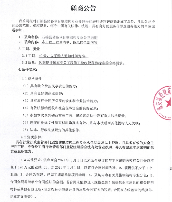 石棉縣儲備項目鋼結(jié)構(gòu)專業(yè)分包采購談判磋商公告