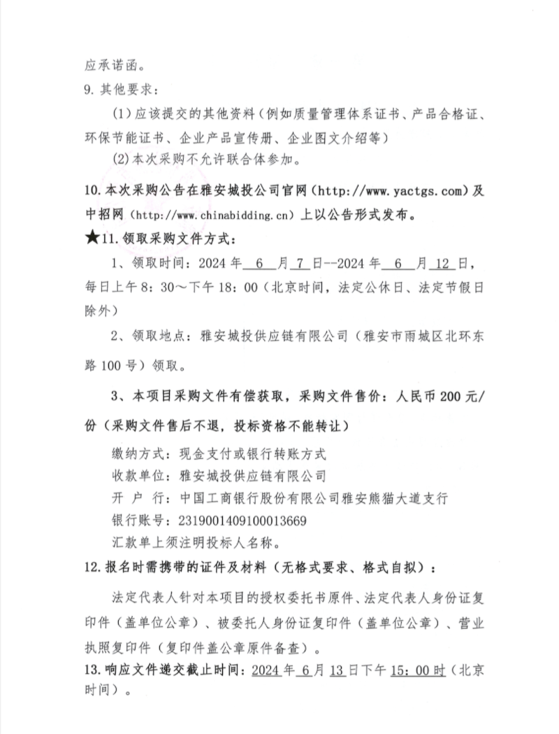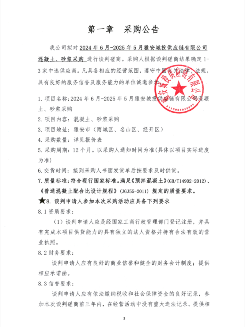 2024年6月-2025年5月雅安城投供應鏈有限公司混凝土、砂漿采購公告