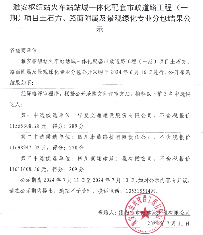 雅安樞紐站火車(chē)站站城一體化配套市政道路工程(一期)項(xiàng)目土石方、路面附屬及景觀綠化專業(yè)分包結(jié)果公示