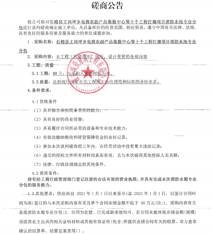 石棉縣王崗坪鄉(xiāng)電商農(nóng)副產(chǎn)品集散中心等十個工程打捆項目消防水池專業(yè)分包談判磋商公告