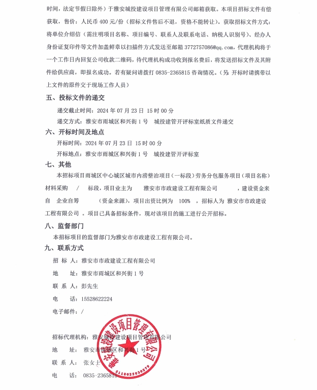 雅安市城區(qū)中心城市內(nèi)澇整治項(xiàng)目(一標(biāo)段)勞務(wù)分包服務(wù)項(xiàng)目(項(xiàng)目名稱)材料采購招標(biāo)公告