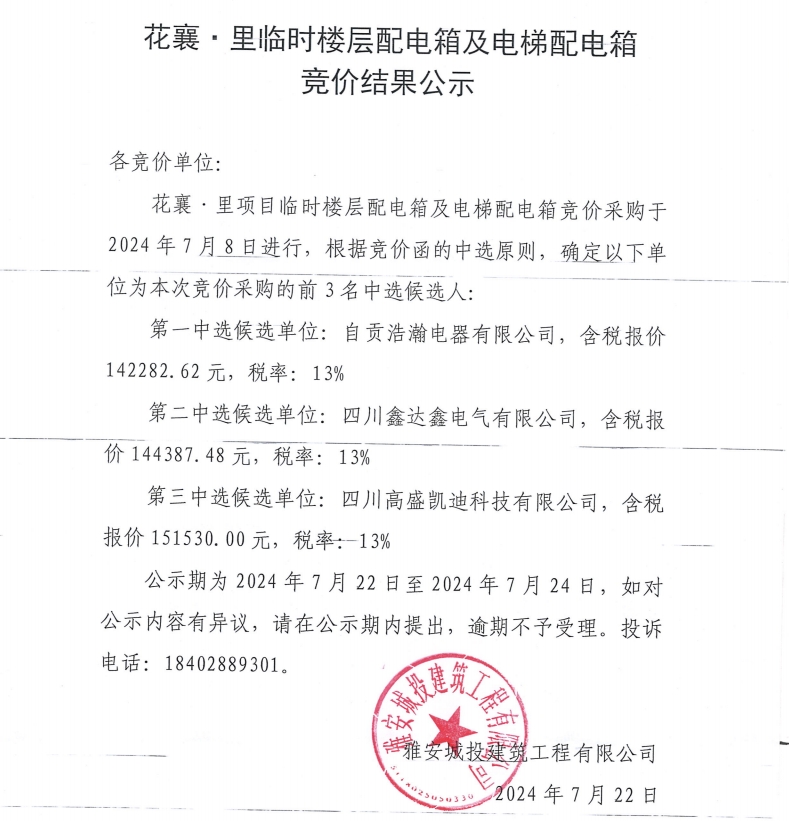 花襄·里臨時(shí)樓層配電箱及電梯配電箱競(jìng)價(jià)結(jié)果公示