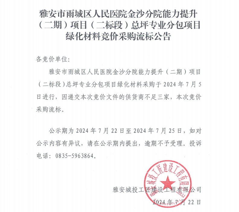 雅安市雨城區(qū)人民醫(yī)院金沙分院能力提升(二期)項目(二標(biāo)段)總坪專業(yè)分包項目綠化材料競價采購流標(biāo)公告
