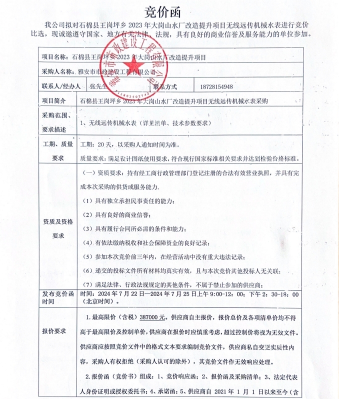 石棉縣王崗坪鄉(xiāng)2023年大崗山水廠改造提升項(xiàng)目無(wú)線遠(yuǎn)傳機(jī)械水表競(jìng)價(jià)公告