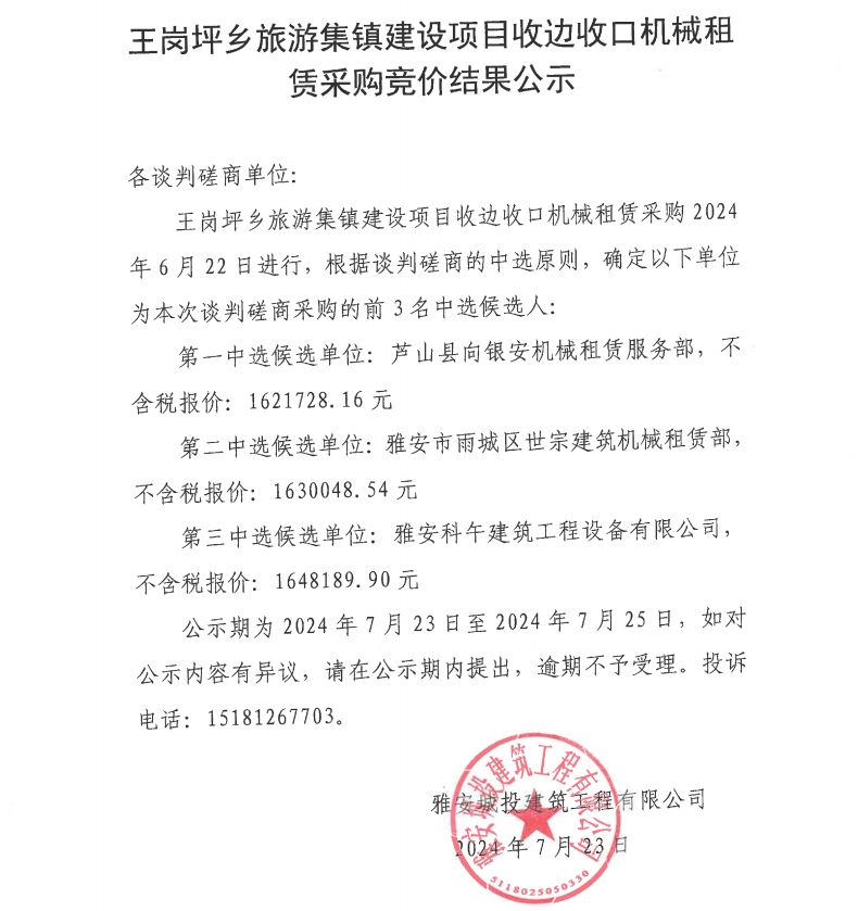 王崗坪鄉(xiāng)旅游集鎮(zhèn)建設(shè)項(xiàng)目收邊收口機(jī)械租賃采購競價(jià)結(jié)果公示