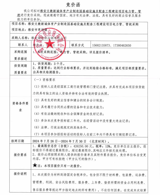 雅安文教新城體育產(chǎn)業(yè)制造園基礎(chǔ)設(shè)施及配套工程建設(shè)項(xiàng)目電力管、管枕采購競價公告