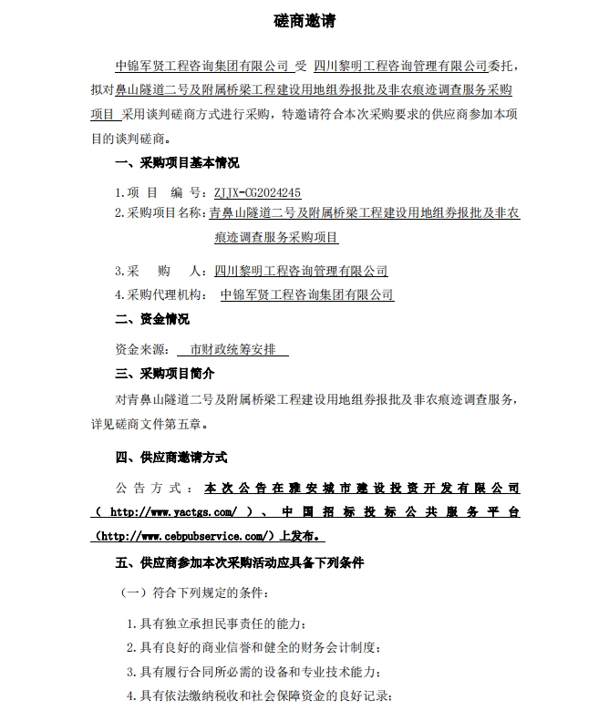 青鼻山隧道二號(hào)及附屬橋梁工程項(xiàng)目用地組劵報(bào)批及非農(nóng)痕跡調(diào)查服務(wù)采購項(xiàng)目磋商邀請(qǐng)公告