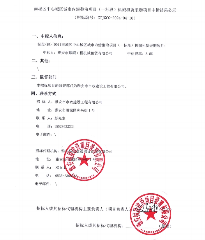 雨城區(qū)中心城區(qū)城市內(nèi)澇整治項目(一標(biāo)段)機(jī)械租賃采購項目中標(biāo)結(jié)果公示
