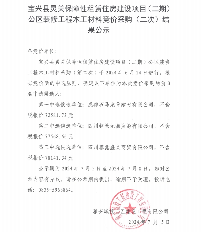 寶興縣靈關(guān)保障性租賃住房建設(shè)項目(二期)公區(qū)裝修工程木工材料競價采購(二次)結(jié)果公示