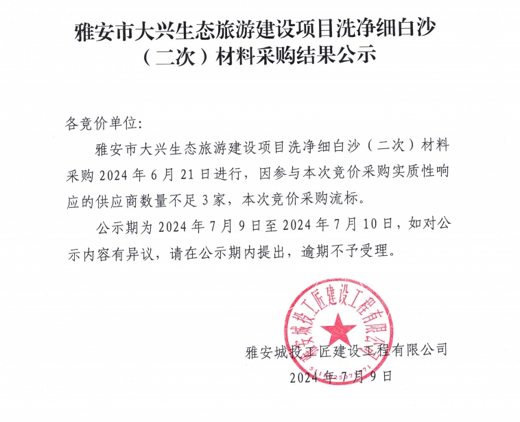 雅安市大興生態(tài)旅游建設(shè)項(xiàng)目洗凈細(xì)白沙(二次)材料采購結(jié)果公示