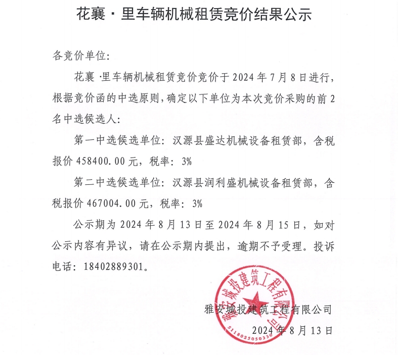 花襄·里項目車輛機械租賃競價結果公示