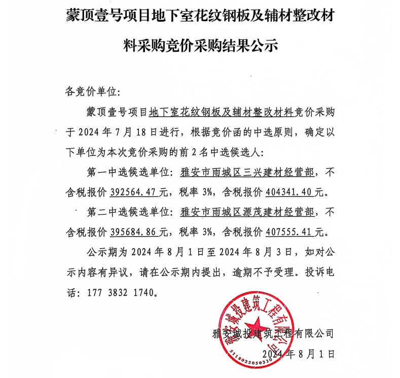 蒙頂壹號項目地下室花紋鋼板及輔材整改材料采購競價采購結(jié)果公示