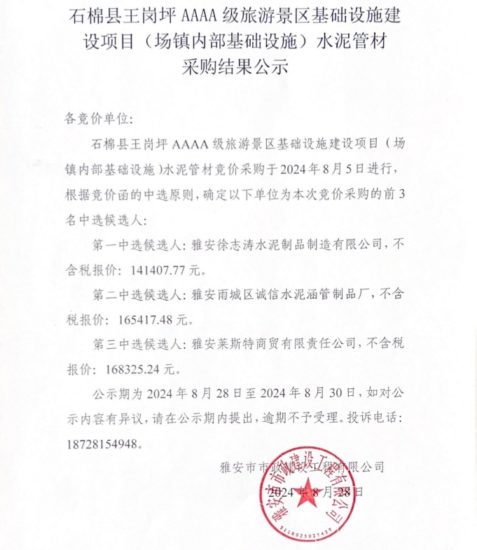 石棉縣王崗坪AAAA級旅游景區(qū)基礎(chǔ)設(shè)施建設(shè)項目(場鎮(zhèn)內(nèi)部基礎(chǔ)設(shè)施)水泥管材采購結(jié)果公示
