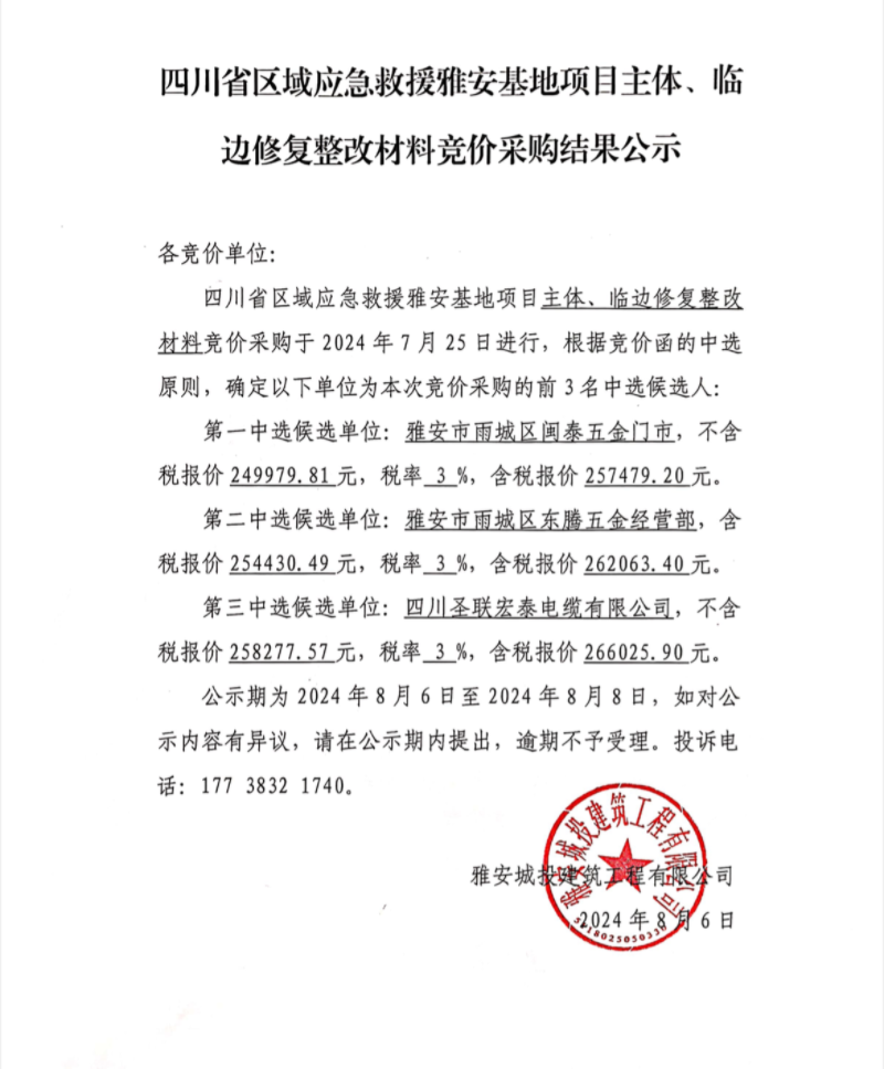 四川省區(qū)域應急救援雅安基地項目主體、臨邊修復整改材料競價采購結(jié)果公示