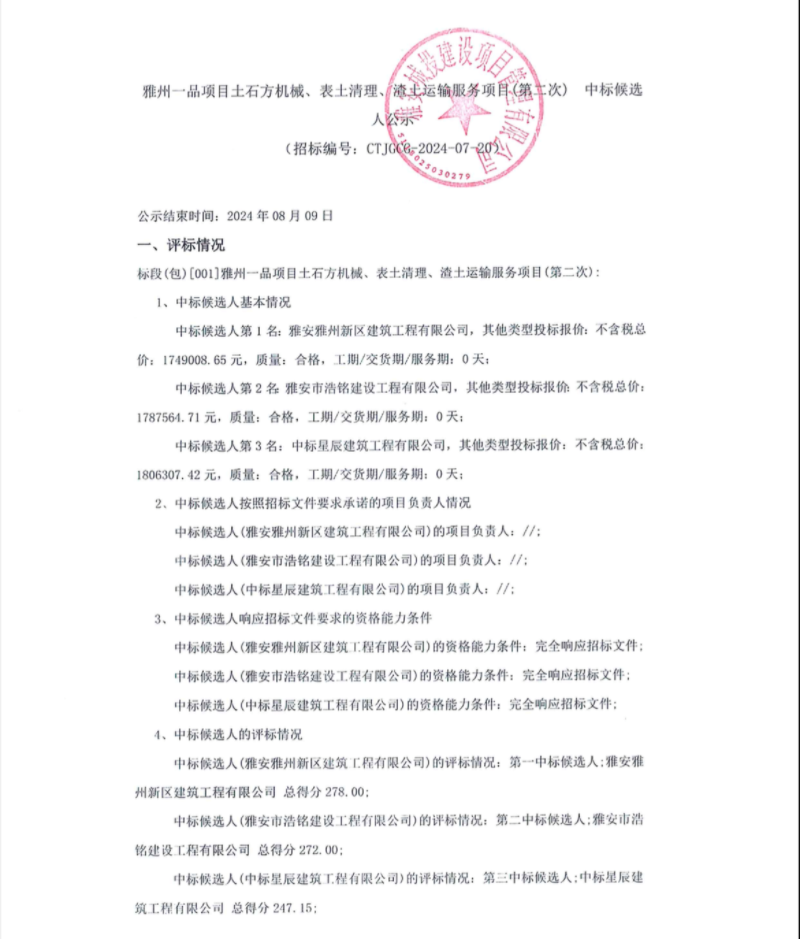 雅州一品項(xiàng)目土石方機(jī)械、表土清理、清土運(yùn)輸服務(wù)項(xiàng)目(第二次)中標(biāo)候選人公示