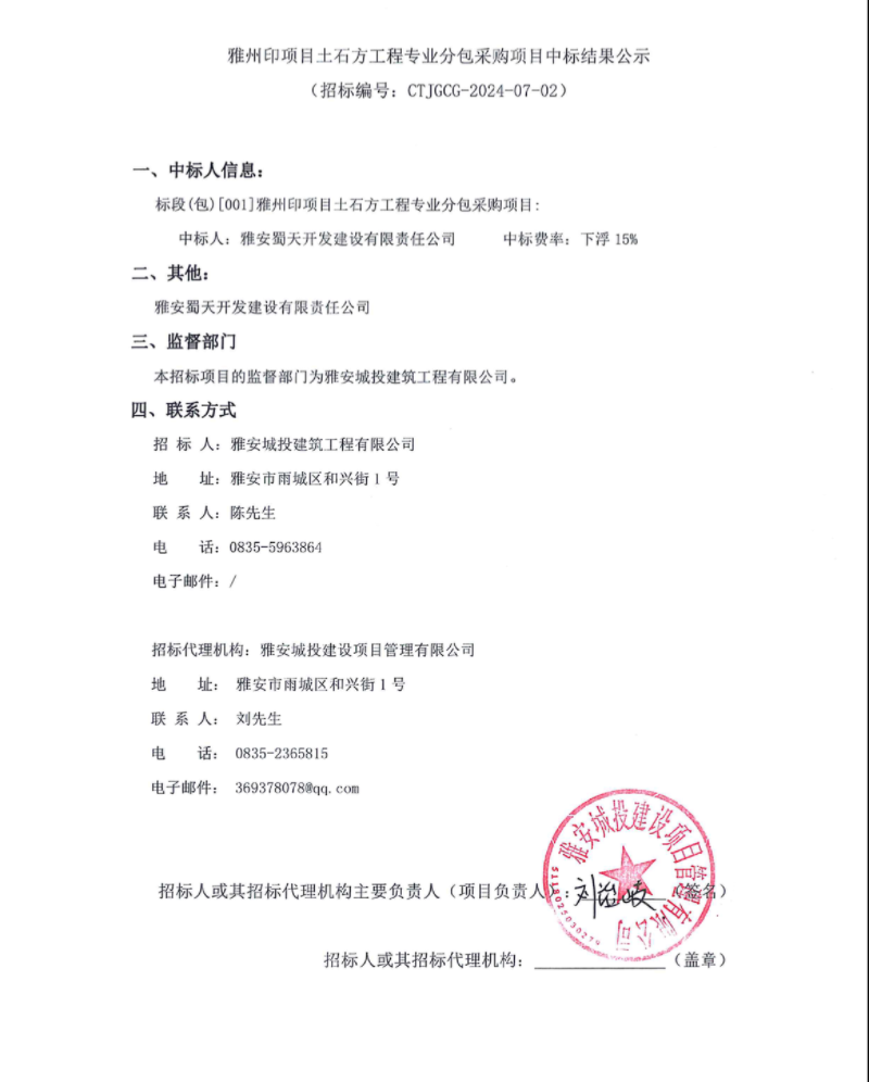 雅州印項目土石方工程專業(yè)分包采購項目中標(biāo)結(jié)果公示