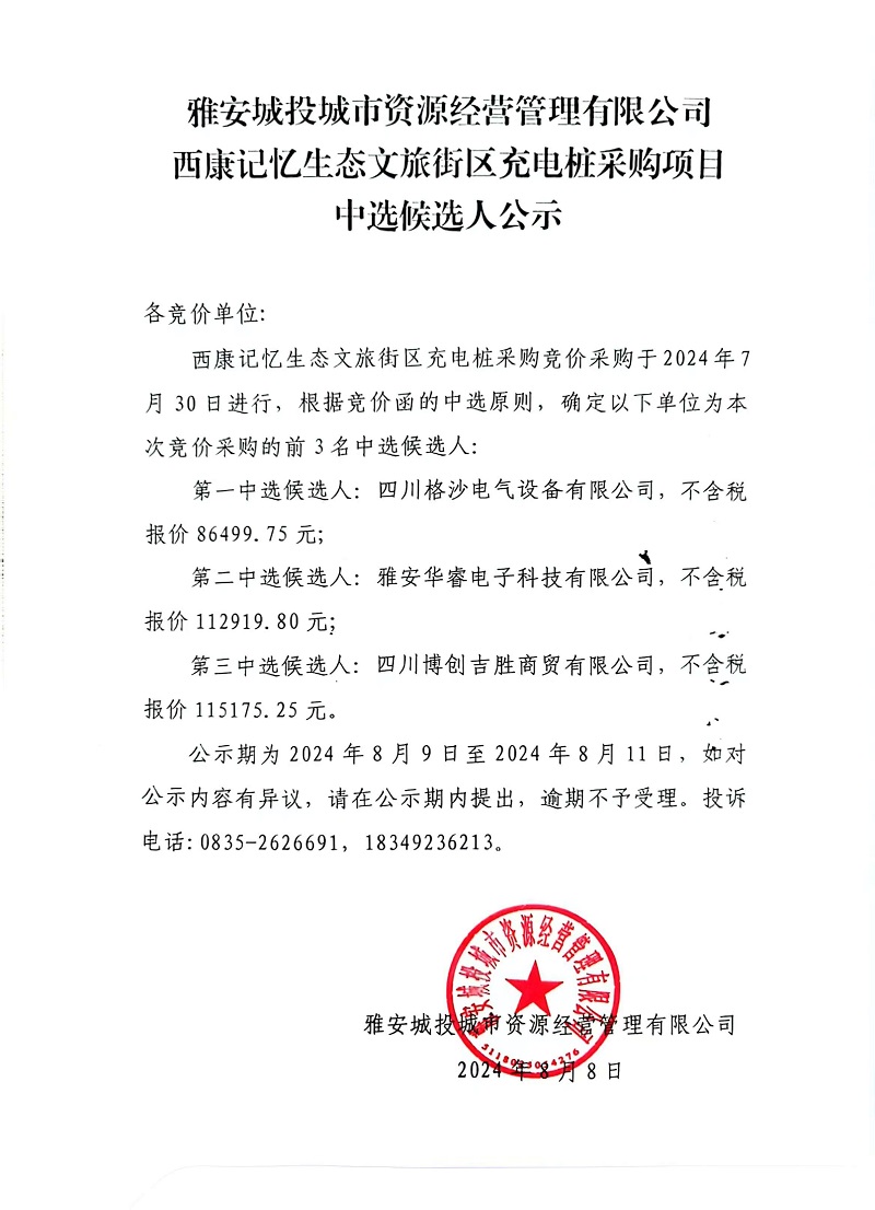 雅安城投城市資源經營管理有限公司西康記憶生態(tài)文旅街區(qū)充電樁采購項目中選候選人公示