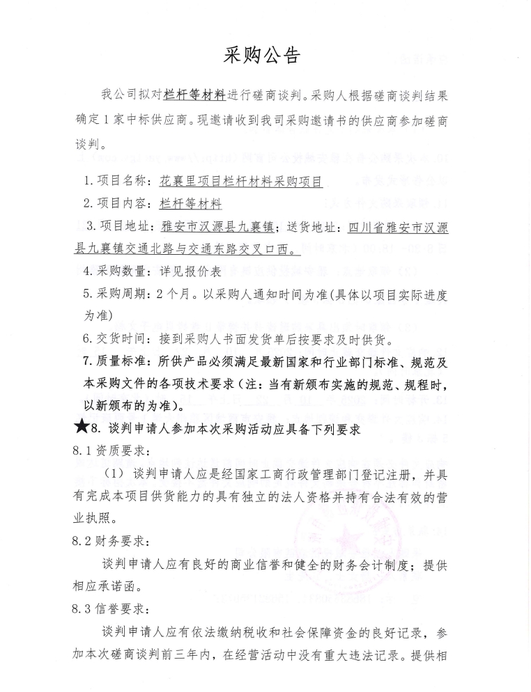 花襄里項(xiàng)目欄桿等材料談判磋商采購(gòu)公告