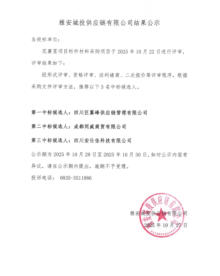 雅安城投供應(yīng)鏈有限公司花襄里項(xiàng)目欄桿材料采購(gòu)結(jié)果公示