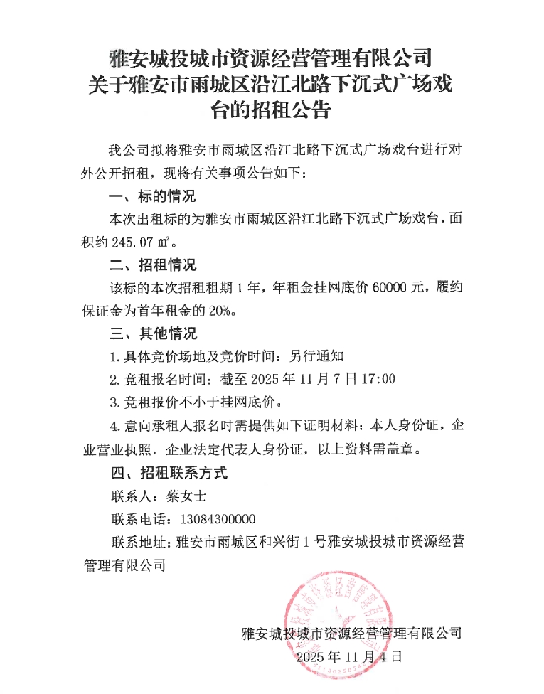 雅安城投城市資源經(jīng)營管理有限公司關(guān)于雅安市雨城區(qū)沿江北路下沉式廣場戲臺的招租公告