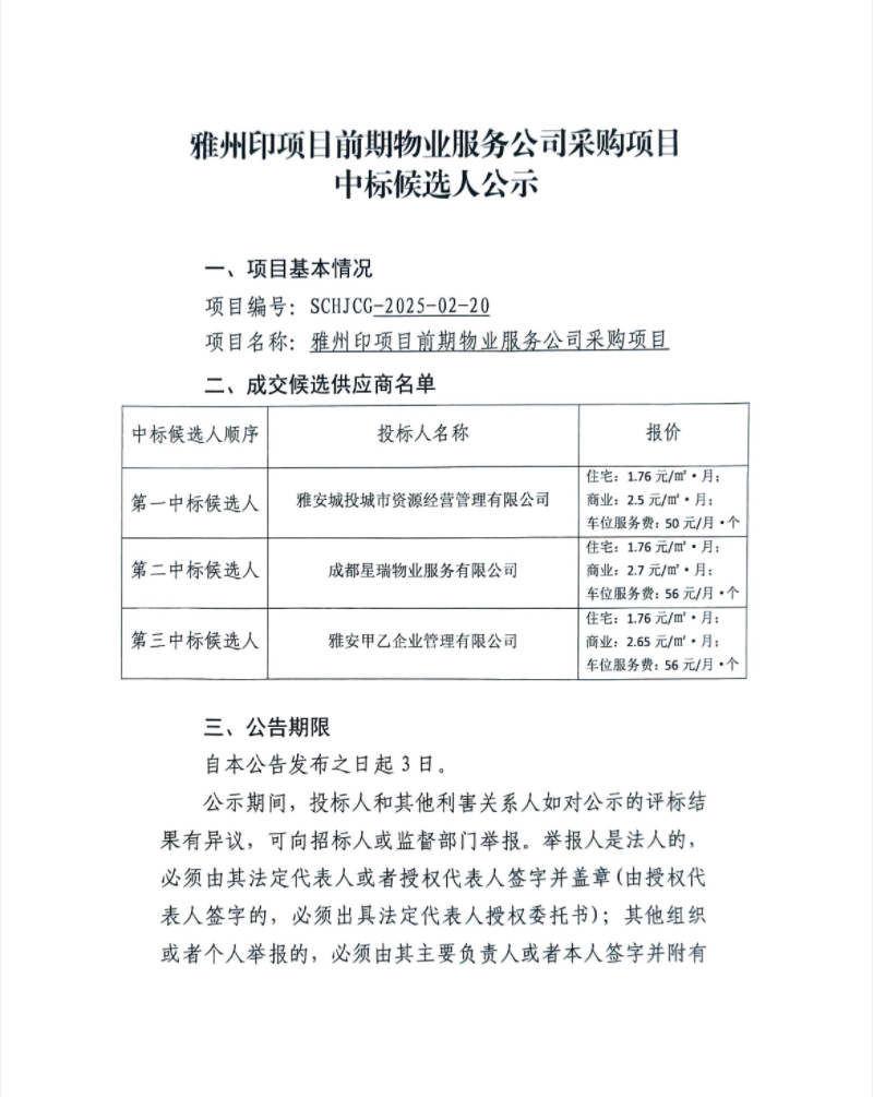 雅州印項(xiàng)目前期物業(yè)服務(wù)公司采購(gòu)項(xiàng)目中標(biāo)候選人公示