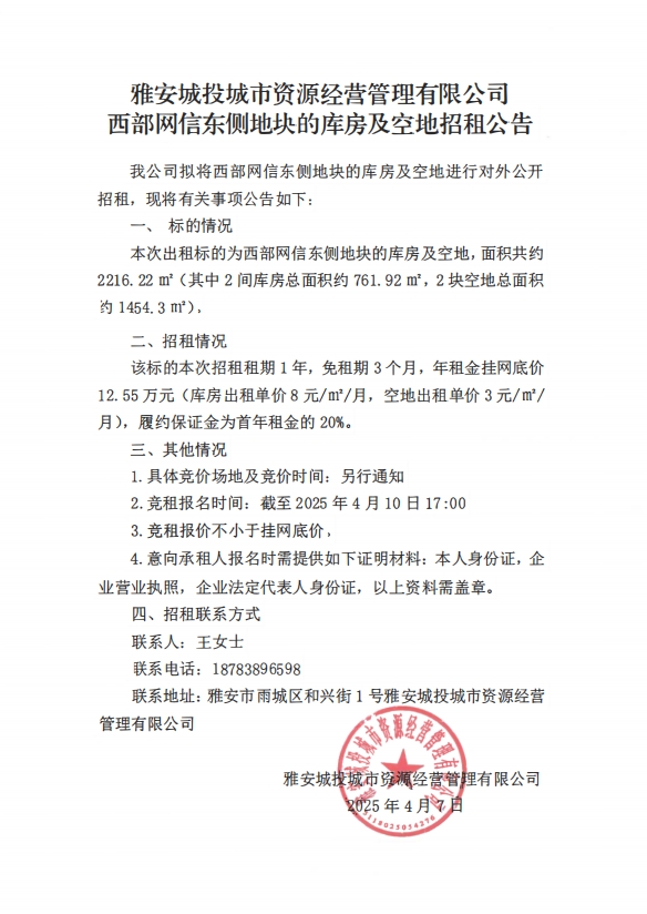 雅安城投城市資源經(jīng)營管理有限公司西部網(wǎng)信東側(cè)地塊的庫房及空地招租公告