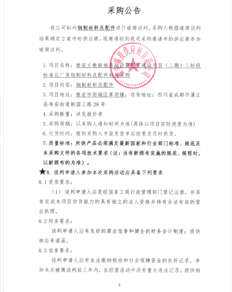 雅安文教新城基礎設施配套建設項目(二期)二標段標準化廠房鋼制材料及配件材料采購公告