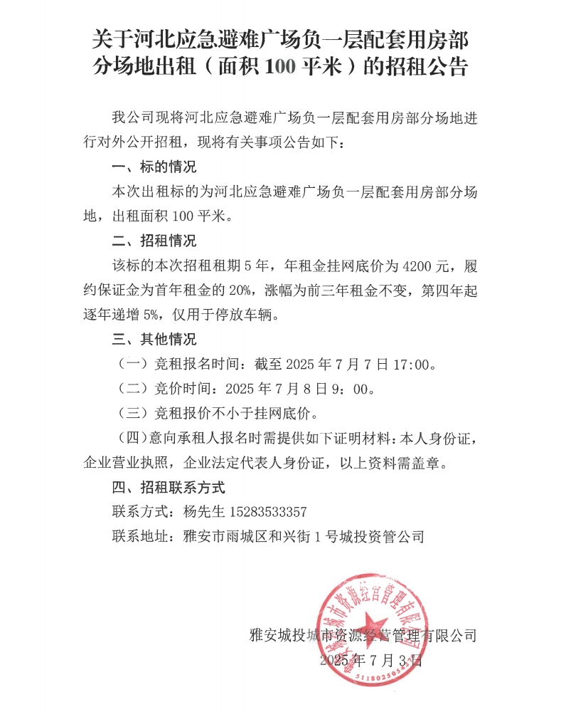 關(guān)于河北應急避難廣場負一層配套用房部分場地出租(面積100平米)的招租公告