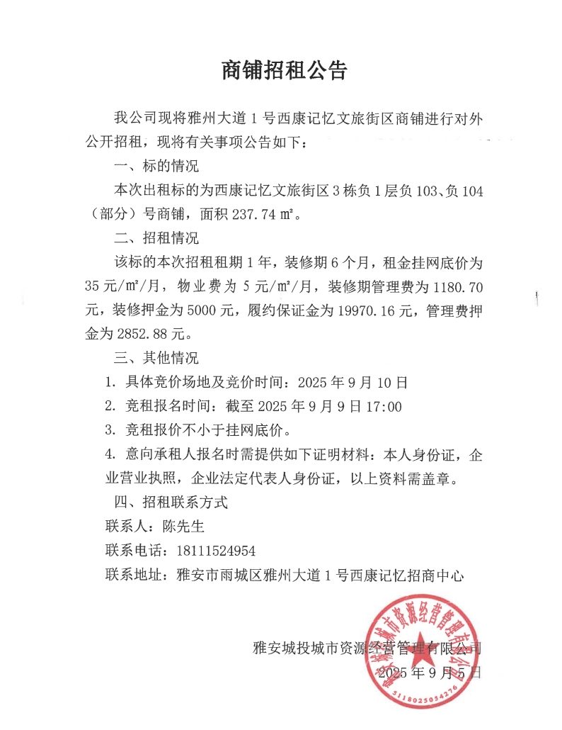 雅州大道1號(hào)西康記憶文旅街區(qū)商鋪招租公告