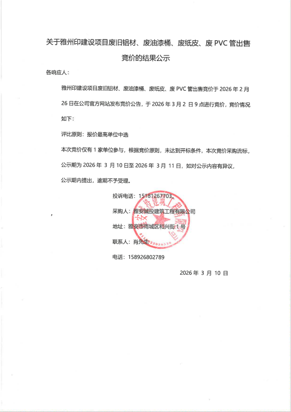 關(guān)于雅州印建設(shè)項(xiàng)目廢舊鋁材、廢油漆桶、廢紙皮、廢PVC管出售競(jìng)價(jià)的結(jié)果公示