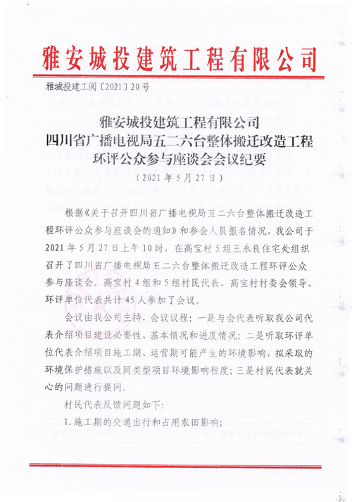雅安城投建筑工程有限公司四川省廣播電視局五二六臺整體搬遷改造工程環(huán)評公眾參與座談會會議紀(jì)要